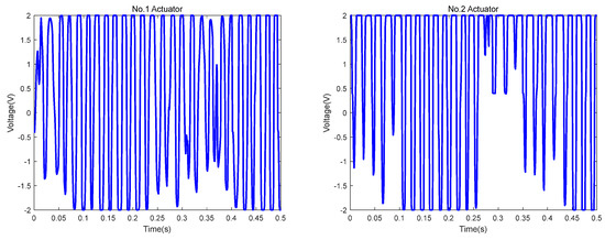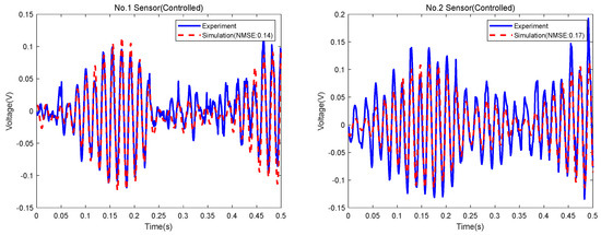 Figure 20 shows the sensor signals obtained by the simulation and experiment. The NMSEs between the experimental and simulation signals from the No. 1 to No. 4 sensors are 14%, 17%, 15% and 19%, respectively. Figure 21 shows the actuator signals obtained by the simulation and experiment. The NMSEs between the experimental and simulation signals from the No. 1 to No. 4 actuators are 17%, 11%, 13% and 15%, respectively.