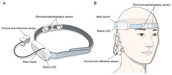 A wearable device for acquiring EEG signals (model: Amp GS5001; SOSO H&C [], Kyungpook University, Daegu, Korea) was used for this study. This device was used in three previous published studies on surgeons’ and nurses’ mental stress [,,]. The device consists of a headband, a main board, two dry electrodes as EEG sensors, and a reference electrode. Two electrodes were positioned at the prefrontal 1 and 2 (Fp1 and Fp2) sites according to the International 10–20 EEG system []. The reference electrode was placed on the right earlobe (Figure 1).