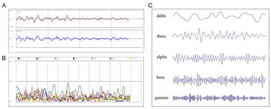 (A) Raw and (B) reanalyzed EEG signals, according to the frequency bands displayed in the MATLAB software. (C) EEG waveforms, according to the frequency bands. EEG: electroencephalography.
