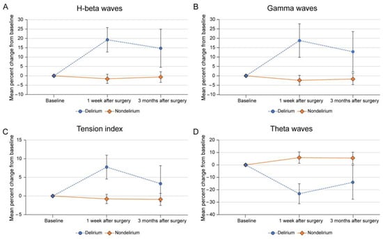 Mean percentage changes in (A) H-beta waves, (B) gamma waves, (C) tension index, and (D) theta waves within 1 week and 3 months after surgery compared to baseline in patients with and without delirium. The error bars shown are standard errors of the mean.