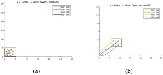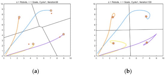 When hi(t) ≤ 0 due to other reasons, the robot is considered to be unable to work normally. In order not to affect the overall task of the formation, the insertion construction method was used to regroup multiple robots and re-divide the task area. Taking the square formation as an example, as shown in Figure 15a,b, four robots form a square formation before the number of iterations k = 120. After that, when the robot in the lower right corner cannot work normally due to a fault, and hi(t) ≤ 0, as shown in Figure 15e, the insertion construction method is used to make the other healthy robots adopt a new formation and reconstruct a new division of the new service area.