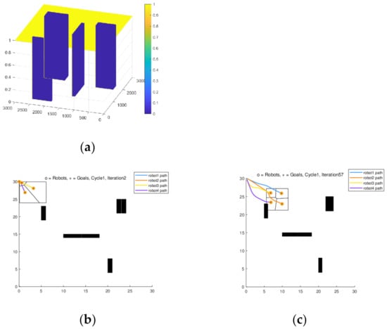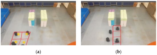 The experiment in the real scene in this study was based on the TurtleBot3 robot, which is a mobile robot platform based on the ROS (robot operating system), with low cost and easy secondary development. Each TurtleBot3 robot can independently establish a local map of its surrounding environment through the gmapping function package provided by ROS, which provides SLAM for lidar, so that the robot can establish a grid-based 2D map according to the input and attitude lidar data. Taking the laboratory map as the designated area Q of the robot formation, we set the condition that there were no obstacles in this area, as shown in Figure 16a. Four TurtleBot3 robots were randomly placed on the map. The robot completes its positioning using SLAM technology. The experimental results are shown in Figure 16b. The experiment was set so that when the Voronoi cost function reaches the optimal solution, the robot will reach the desired formation position under the density function, that is, the target formation is formed. The difference from the simulation experiment is that the density function was not initialized to a constant in the initial stage of the experiment, and the target expected formation was determined first.