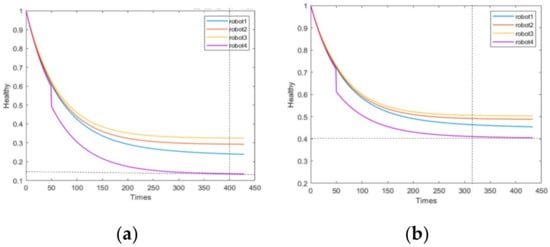 Figure 12a,b describes the results in the second case, where each robot is initialized with the same health level. Figure 12a depicts the health of each robot during formation control without health optimization management. When all the robots reach the final configuration, the health of robot 4 drops more than the rest, reaching the final configuration when hi(t) = 0.04. In Figure 12b, with optimized health management, the same robot extends its lifespan and does not reach the final configuration until hi(t) = 0.38, increasing the lifespan by 34%.