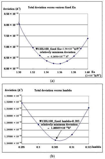 The minimum deviation (δ) in Equation (3) is an achievable way for determining feasible parameters. The minimum requirement gives the best fit. There are three ways to test the goodness-of-fit for each transistor with different channel lengths and channel widths. One way is to fix Kn. Kn fixed at a certain value may help to find different corresponding values of Vth and λ at different values of VG (0.25 V, 0.5 V, 0.75 V, and 1.0 V) by the minimum requirement in Equation (3). All the minimum values at VG = 0.25 V, 0.5 V, 0.75 V, and 1.0 V are summed over and give a final total minimum deviation at the specific fixed Kn. Different final total minimum deviations are compared as shown in Figure 1a for the transistor denoted by W120L100. The least minimum deviation determines the final Kn of the respective transistor. All the Kn values are collected and listed in Table 1 [,,,,,,,,].