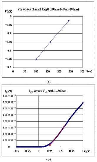 One intriguing observation is concerning negative Vth values. As shown in Figure 4a, Vth values plotted against channel length, surprisingly, is seen to be linear and the slope is determined to be 1.6071 (Volt/micron), as presented in Equation (4).