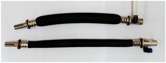 A pneumatic muscle is a type of single-acting cylinder which, under the influence of an increase in internal pressure, increases its volume by increasing its diameter while reducing its length. Changing the length of the cylinder is used as a working movement []. The basic physical quantities describing the behavior of a muscle in a steady state are internal hypertension p muscle length l and the force generated by the F muscle. In 1957, Dr. Joseph L. McKibben used the pneumatic muscle he had developed to propel his limbs. This muscle consisted of an elastic bladder placed freely inside a braid of inextensible fibers. At the ends, the braid and the bladder were connected which allowed for the transfer of the forces generated by the muscle and the working medium, which was carbon dioxide. This muscle is often referred to as “McKibben’s muscle”. In 1980, the Bridgestone Rubber Company commercialized the pneumatic muscle on a massive scale by introducing a muscle that was an improvement on Dr. McKibben’s design. Currently, pneumatic muscles are mainly offered by two companies: since 1987, Shadow Robot Company has been producing and selling muscles modeled on the McKibben project, while in 1999, Festo, a well-known manufacturer of pneumatic devices, introduced pneumatic muscles that could be tailored to individual applications. It is fundamentally different in structure from McKibben’s muscle. In the Festo project, the braid and the rubber bladder are fused along the entire length of the muscle. The view of the muscle in this version is shown in Figure 1. This solution significantly increases the resistance of the muscle to mechanical damage and increases its durability. However, it has the disadvantage of a lower relative shortening of the muscle and, hence, less effective working movement is generated by the muscle.