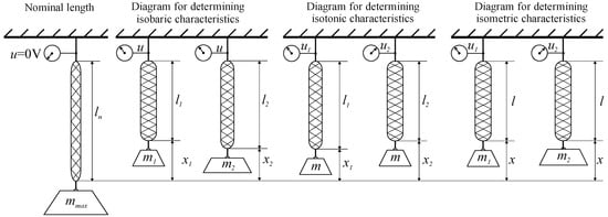 In order to verify the assumed thesis, first the static and dynamic characteristics of a single muscle were determined. In this servo drive proportional piezoelectric pressure servo valves Hoerbiger Tecno Plus with output pressure were used to supply the muscle with the working medium p = 0−1 MPa and control signal u = 0−10 V. A single muscle, along with its associated valve and connecting line, is the object being analyzed. In steady state, this object is characterized by three quantities: valve servicing voltage u being the input signal for the object and the force generated by the muscle F and muscle tip position x, which are the output signals of the object. When determining all the characteristics, it was assumed that the position of the muscle tip is the difference between the nominal length of the muscle ln and its current length l expressed in millimeters. For the examined muscle, the nominal length was ln = 350 mm. In steady state hypertension prevailing inside the muscle p linearly corresponds to the control signal u by dependence p(MPa) = 0.1 u(V). The relationship between the three quantities characterizing the muscle can be represented as three types of static characteristics: isobaric—the dependence of the position on the loading force, with a constant value of the control voltage for several voltage values x = g(F); u = const, isotonic—dependence of the position on the control voltage at constant loading force, for several strength values x = g(u); F = const and isometric—force dependence on the control voltage, with a constant muscle position, for several position values F = g(u); x = const. The scheme for determining these characteristics is presented in Figure 2. However, the behavior of the object over time can be determined by determining two families of dynamic characteristics, one for each of the object’s output quantities. The first family of dynamic characteristics presents the relationship of muscle position x since t as a response to a step change in the valve control signal u, with constant muscular force F. The second family of characteristics shows the dependence of the force generated by the muscle F since t as a response to a step change in the control signal u with a fixed position of the muscle tip x [].