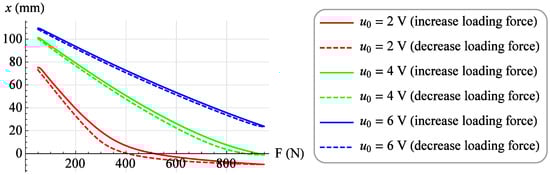 A set of isobaric characteristics was determined for the value of the control signal u from 0 V to 6 V. For each value of the control signal, the value of the loading force F was increased from 50 N to 950 N with a step of 10 N, and after waiting for a period of time equal to 3 seconds, the value of the muscle position x was read. Then, measurements were made at the same control voltage u by reducing the value of the loading force F from 950 N to 50 N with the same step and also, after waiting for a period of time equal to 3 s, the value of the muscle position x was read. As a result, a family of isobaric characteristics was obtained. Figure 4 shows exemplary isobaric characteristics for the values of control voltages u = 2 V, u = 4 V and u = 6 V, when increasing (solid line) and decreasing (dashed line) the loading force F.
