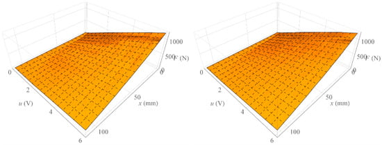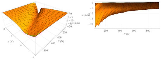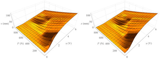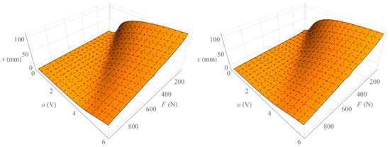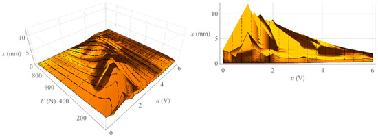 Figure 8 shows the surface formed by all isotonic characteristics determined when increasing the value of the control signal (left) and the surface formed by all isotonic characteristics determined by decreasing the value of the control signal (right). On the other hand, Figure 9 shows the surface representing the amount of mechanical hysteresis for the entire family of isotonic characteristics.
