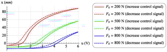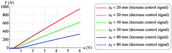 Moreover, a family of 23 isometric characteristics were determined for constant values of the muscle position x from 0 mm to 110 mm with a step of 5 mm. For each position value, the value of the control signal u was increased from 0 V to 6 V with a step of 0.1 V, and after waiting for a period of 3 s, the value of the force generated by muscle F was read. Then, for the same value of muscle position x, measurements were made at decreasing the value of the control signal u from 6 V to 0 V with the same step. Figure 10 shows selected isometric characteristics for the position of the muscle x = 20 mm, x = 50 mm and x = 80 mm for increasing (solid line) and decreasing (dashed line) the value of the control signal.