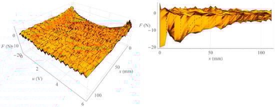 Figure 5 shows the surface formed by all isobaric characteristics determined by increasing the loading force (left) and the area formed by all isobaric characteristics determined by decreasing the loading force (right). On the other hand, Figure 6 shows the area representing the amount of mechanical hysteresis for the entire family of isobaric characteristics.