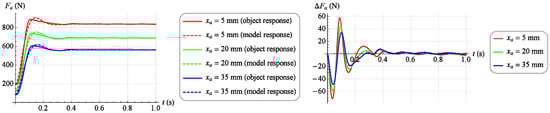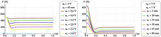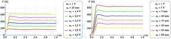A family of dynamic characteristics was determined in the form of changes in force F as the object’s response to a step change in the valve control signal u, with a constant value of the muscle position . A series of measurements was performed for 17 different values of the muscle position in the range from 0 mm to 80 mm. The test for a given position value was performed by a step change of the control signal from value  to value . In contrast, the measurement of the force generated by the muscle was carried out for a period of 1 second with a sampling frequency of 1 kHz. Figure 12 (left) shows selected dynamic characteristics for the constant value  of the muscle displacement equal to . On the other hand, Figure 12 (right) shows selected dynamic characteristics for  and at different values of muscle displacement.