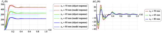 As before, a family of dynamic characteristics was determined representing the change in force generated by the muscle as a response to a step change of the control signal from value  to value . These tests were performed for 17 different values of the muscle position  ranging from 0 mm to 80 mm. The force measurement period and sampling frequency did not change. Figure 13 and Figure 14 (left) shows selected dynamic characteristics with a constant value of the muscle position . On the other hand, Figure 13 and Figure 14 (right) shows selected dynamic characteristics for  and at different values of the muscle position.