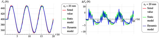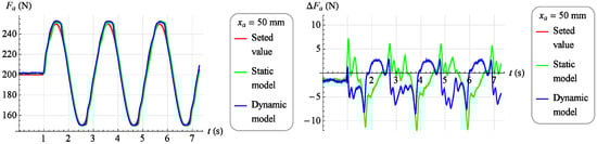 A set force value was introduced into the dynamic inverse model  in the absolute coordinates the muscle is to work out, the current value of the force generated by the muscle , in absolute coordinates, and the current position of the muscle , in absolute coordinates, specifying the working point of the object. The value of force in the coordinates of deviations was determined as the difference between the set value and the actual value . The model, however, generated a control signal  fed to the control valve. Similarly to the static inverse model, a set force value was introduced  and current muscle position value , and the model generated a control signal . In Figure 18 and Figure 19, results of the verification of both developed models are presented. The charts on the left show in red the set value of the force which the muscle was to develop, in green the measured value of the force generated by the muscle while controlling the static model and the blue color is the measured value of the force generated by the muscle when controlling the dynamic model. However, on the right side there are control deviations using both models. In Figure 18, the verification results for the set signal described by the dependence are presented  with a stable muscle position .