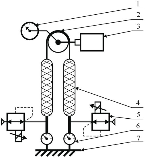 The servo drive consists of two pneumatic muscles (4). In each of them, one end was immobilized by connecting it to the fixed base (7) through a strain gauge force sensor (6) with a range of . The free ends of the muscles are connected together by the toothed belt (2) driving the toothed wheel with a pitch diameter of , thus creating a toothed belt transmission, by means of which the push-pull movement of the muscles is converted into a rotational movement of the arm. The pitch diameter of the pulley and the length of the muscles allow the servo drive to move in the range  to , and the maximum force generated by a single muscle allows you to work out a torque of . The servo drive is also equipped with two pneumatic pressure servo valves (5) controlling the work of the muscles and an absolute angular position sensor (1) with a resolution of 16 bits per revolution, allowing for measuring the angular position with  accuracy. The diagram also shows an electric servo drive (3), which was used on the test stand to load the muscle servo drive with a given moment of force.
