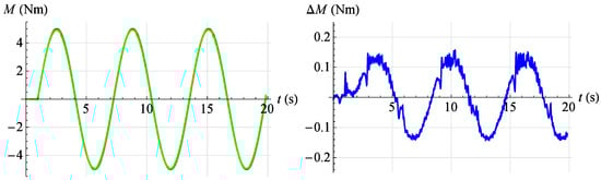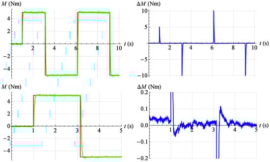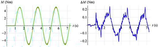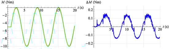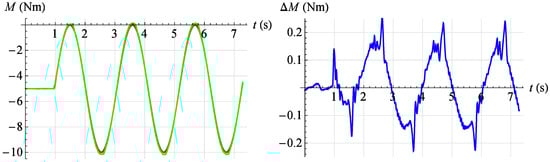 In Figure 22, Figure 23, Figure 24, Figure 25 and Figure 26, the results of tests of the developed servo drive maintaining the set moment of force are presented. On the left, the set point waveform is shown in red and the actual value waveform is shown in green. On the right, the error of the servo drive is shown in blue. In Figure 22, the servo drive response to a given sinusoidal signal described by the relationship is shown  at an angular position . However, in Figure 23, the servo drive response to a given sinusoidal signal described by the relationship is shown  at an angular position .