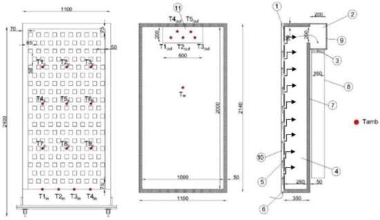 GTC design details: 1—transpired steel plate; 2—plenum; 3—fan; 4—inner cavity; 5—glazing; 6—air inlet; 7,9—thermal insulation; 8—air duct; 10—air layer between glass and absorber; 11—air outlet.