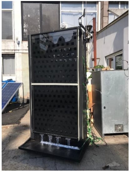 This second experimental study is performed by means of a full-scale experimental building, using a light container-type structure (6 m × 2.4 m × 2.5 m). The optimized GTC (with a distance between the perforated plate and the glass of 30 mm), according to the results presented above, is mounted on the façade of the container (Figure 6).