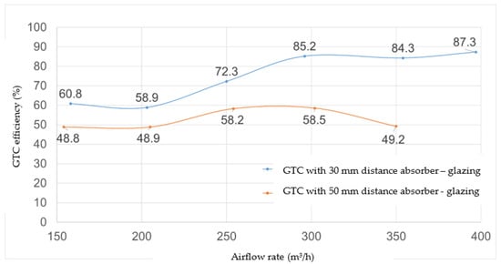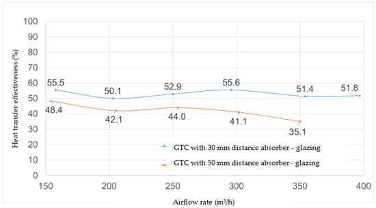 It can be seen that the heat transfer efficiency within the GTC was superior in the case of the 30 mm distance between the absorber plate and the glass layer. Furthermore, for this configuration, the heat transfer effectiveness was constant, around 50–55%, regardless of the airflow rate through the solar collector.