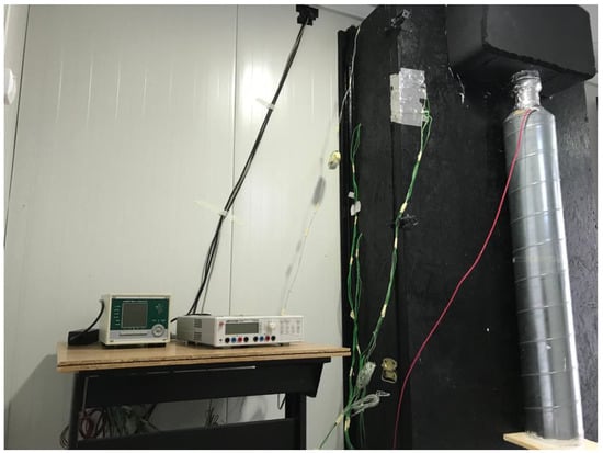 The value of the airflow rate through the GTC is correlated with the required fresh air of the experimental building. Consequently, the imposed airflow rate was 72 m3/h, meaning 2 h−1 ACH (air changes per hour)—suggested outdoor air ventilation rate []. In order to achieve this low airflow rate, the GTC was equipped with an EBM-Papst 4184N/2X variable-speed fan and Rohde & Schwarz HMP2020 programmable power supply (output voltage 0–32 V DC; output voltage resolution 1 mV; voltage stabilization ≤ 0.01% + 2 mV; output current 0-10 A; output current resolution 1 mA; and current stabilization ≤ 0.01% + 250 µA)—Figure 8.