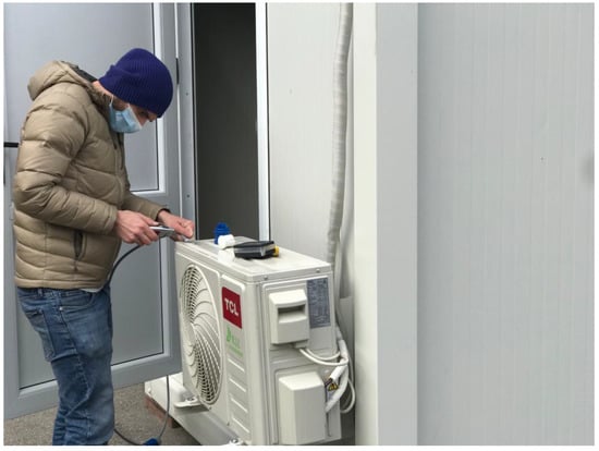 The experimental building was equipped with an air conditioning unit (2.6 kW capacity)—Figure 9. This equipment is used for the heating of the experimental building, operating in “air-to-air” heat pump mode.