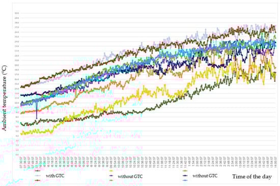 It can be noticed, based on the data from Table 4 and Table 5, that both the air outlet–inlet difference temperature and the absorber temperature decreased linearly with the increase in the airflow through the GTC. This is valid for both analyzed configurations. On the other hand, the rise in temperature of the air passing through the GTC was roughly 4–5 °C higher in the case of the GTC configuration with 30 mm distance between the absorber and the glazing for the same values of airflow rates. This is due to the modified space between the absorber and the glass layer, but it must also be taken into account that the experimental tests for the GTC configuration with a 30 mm air gap among the absorber and the glazing benefited from more important solar radiation intensities and higher ambient air temperatures on some days. Nevertheless, Ferahta et al. [] highlighted the same phenomenon: increased air layer thickness between the absorber and the glass affects the heat transfer within the solar collector due to an enhancement of heat losses through convection at the front (glazing) of the solar collector.