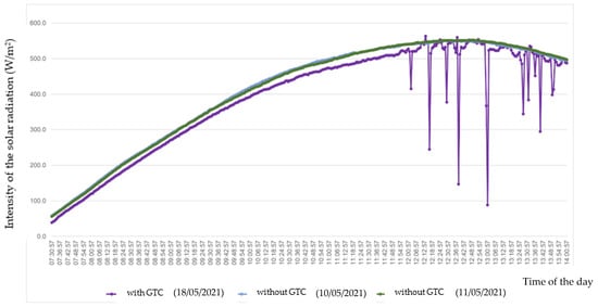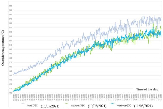 For this reason, we selected for our analysis only the sequences of days with somewhat similar outside temperature and sunshine. For instance, one of the best such sequences for comparisons without/with a GTC is for the following days: 10 May 2021 and 11 May 2021 for the building without a GTC and 18 May 2021 for the building with a GTC. The diurnal variation in the solar radiation and air temperature for these days is shown in Figure 13 and Figure 14, respectively.