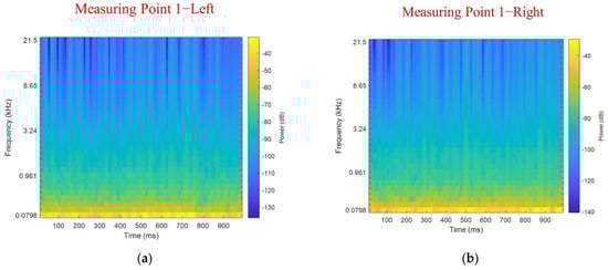 There were 22 recorded noise samples from each measuring point. Each recorded noise sample was clipped to 5 s. The duration of each sample should not be too long; otherwise, the jury of the subjective test would be tired and make inaccurate judgments [19]. Besides, the noise samples should be clear without talking sound. The test length of each subject was approximately 15–25 min. The subjective evaluation process is shown in Figure 4. Figure 5 shows the Mel spectrogram of the binaural stimuli of some measuring points.