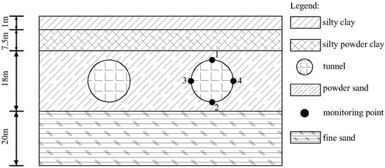 The landform of the engineering site belongs to the alluvial plain of the middle and lower reaches of the Yangtze River, which is mainly the first-class terrace of the Yangtze River. The elevation of Wuwei bank ranges from 2.0 to 11.5 m, and that of Wuhu bank ranges from 3.5 to 11.7 m. The Yangtze River flows through the tunnel site area in the southwest–northeast direction, and the riverbed is irregularly U-shaped. The perennial water depth is about 30 m. As shown in Figure 2, the stratigraphic structure of this site is complex. The strata from top to bottom are silty clay, silty powder clay, powder sand, and fine sand. The thicknesses of the strata are about 1 m, 7.5 m, 18 m, and 20 m, respectively. The buried depth of the tunnel’s initial end is approximately 10.43 m. During the tunneling process, monitoring points were set up at the top, bottom, left, and right sides of the tunnel, as shown in Figure 2.