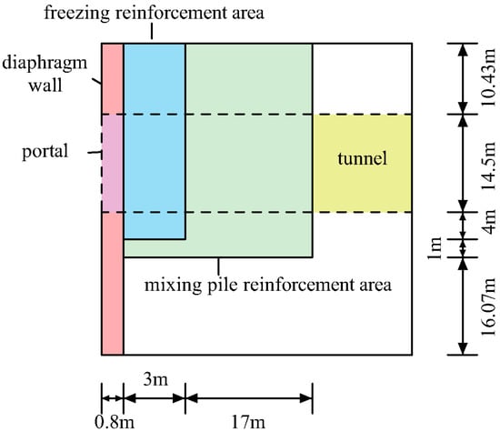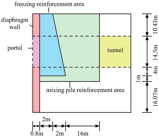 The triaxial mixing pile and rectangle freezing method were used in the Wuhu River-Crossing Tunnel. The authors have carried out many studies on the triaxial mixing piles reinforcing the tunnel end alone. The results show that if the triaxial mixing pile’s longitudinal length is 5 m, the maximum tunnel portal deformation is approximately 25 mm. The deformation value is above the allowable value of 15 mm [,]. To highlight the effect of the freezing soil mass, the triaxial mixing pile’s longitudinal length was 5 m in this section.