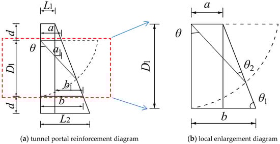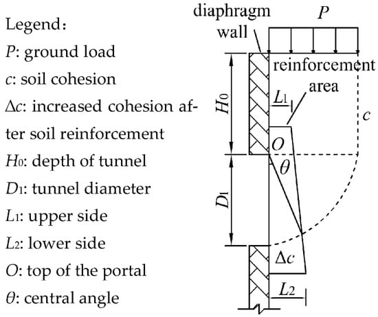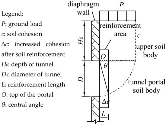 The soil body of the tunnel portal is subjected to the upper soil body load and ground load P. When the sealing door is removed, the tunnel portal soil body equilibrium is broken and a sliding surface may be formed. Thus, damage occurs, as shown by the dashed line in Figure 4. This sliding surface is assumed to be a circular arc, with the top of the tunnel portal as the center and the diameter D1 of the tunnel portal as the radius. The sliding moment is greater than the resistance moment on the circular arc surface. To enhance the stability of the soil body in the tunnel portal area, it is necessary to reinforce the soil body and enhance the resistance moment on the sliding surface. The sliding moment of the soil body consists of three parts, which are the sliding moment caused by the ground load P, the sliding moment caused by the self-weight of the upper soil body, and the sliding moment caused by the self-weight of the sliding soil body. The resistance moment of the soil body is composed of the resistance moment of the soil body before reinforcement and the increasing resistance moment after reinforcement of the soil body. The increased resistance moment after reinforcement of the soil body is especially critical for tunnel portal stability. These expressions can be computed as followed.