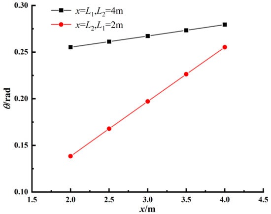 Firstly, the lower side’s length L2 of the trapezoidal freezing soil mass is 4 m, while the upper side’s length L1 ranges from 2 m to 4 m. The upper side length of the trapezoidal soil mass is 2 m, while the lower side’s length L2 ranges from 2 m to 4 m. Figure 7 shows the value of the central angle θ for different L1, and L2. The relationship between θ and L1 can be obtained by linear fitting with when the correlation coefficient is above 0.99. The relationship between θ and L2 can be obtained by linear fitting with , and the correlation coefficient is also above 0.99.