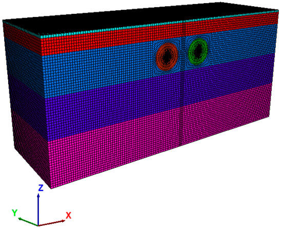 According to the engineering design data, the outer and inner diameters of the tunnel are 14.5 m and 13.3 m, respectively. The distance between the two tunnels is 21 m, and the buried depth of the tunnel center is 17.68 m. The length of the numerical model is 151.5 m, the width is 90 m, and the height is 69.93 m. The model is divided into five strata: silty clay, muddy silty clay, silt, fine sand, and medium-weathered siltstone, from top to bottom. The thickness for each stratum is 1 m, 7.5 m, 18 m, 20.5 m, and 22.93 m, respectively. The numerical calculation model is shown in Figure 9, and was established using FLAC3D numerical simulation software.
