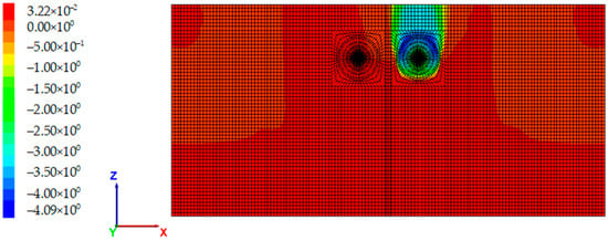 Figure 12 is the y-direction displacement contour on the longitudinal section of the tunnel with the real end reinforcement method. It can be seen from the figure that when the portal is broken, the soil behind the portal shows an outward movement trend. The y-direction displacement at the center of the portal is the largest, at −9.91 mm.