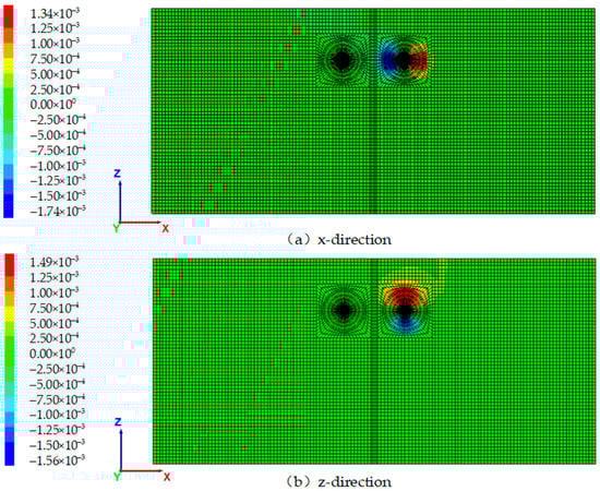 From Figure 11, it can be seen that the x-direction displacement is the largest on the left and right sides of the portal, which are −1.74 mm and 1.34 mm, respectively. The z-direction displacement is the largest at the top and bottom of the tunnel, which are 1.49 mm and −1.56 mm, respectively. Compared with the displacement of the unreinforced portal, the z-direction displacement of the reinforced portal decreases significantly.