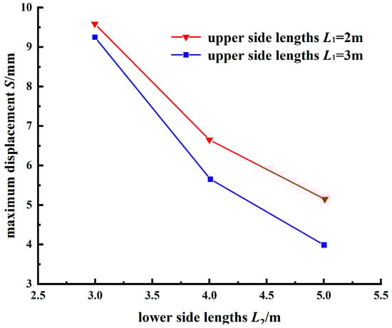 Maximum displacement of tunnel portal corresponding to different lower side lengths of the trapezoidal freezing soil mass.