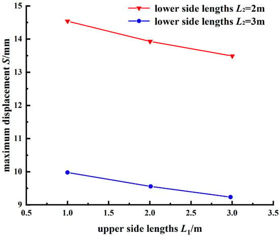 Maximum displacement of tunnel portal corresponding to different upper side lengths of the trapezoidal freezing soil mass.