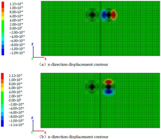 Figure 16 shows the displacement contour of the tunnel portal with the optimization scheme. Figure 16a shows that x-direction displacement is relatively larger on the left and right sides of the portal. The maximum x-direction displacements are −1.09 mm and 1.14 mm, respectively, on the left and right sides of the tunnel portal. Figure 16b shows that the z-direction displacement is relatively larger on the top and bottom of the tunnel portal. The maximum z-direction displacements of the portal are −1.12 mm and 1.14 mm, respectively, on the top and bottom of the tunnel portal.