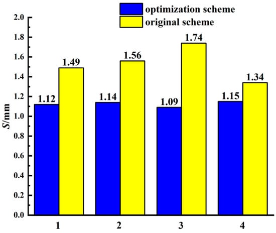 Figure 18 shows the monitoring point displacement of the tunnel portal with the optimization scheme or the original scheme. From the figure, it can be seen that the displacement of the portal with the optimization scheme is always lower than that of the portal with the original scheme. The maximum reduction ratio is 37.4% and the minimum reduction ratio is 14.2%.