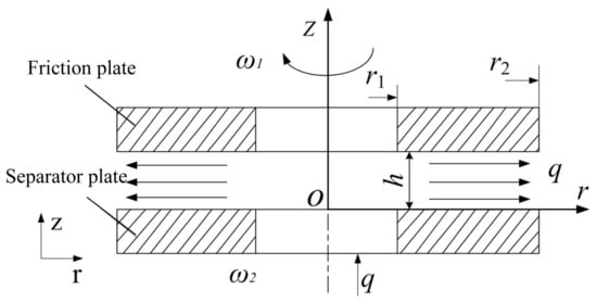 Simplified model for friction pair (ω1 is rotation speed of friction plate; ω2 is rotation speed of separator plate; r1 is inner radius; r2 is outer radius; h is oil film thickness; q and nearby arrows are directions of oil flow).