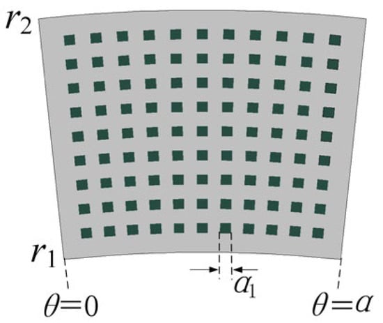 Uniform distribution of hexahedron textures (r1 is inner radius; r2 is outer radius; α1 is angle of a texture structure; θ is center angle; The dark area is textured area; The light-colored area is the non-textured area).