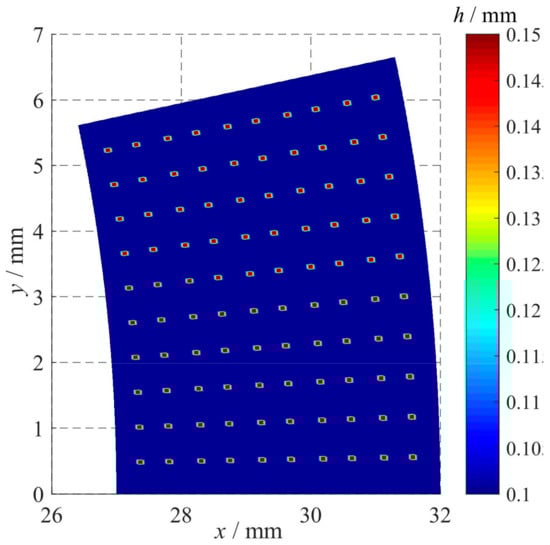 After defining the circumferential left and right boundaries Φl and Φr and the radial upper and lower boundaries CR1 and CR2 of the texture dimple, the oil film can be divided into two parts: the texture area and the non-texture area. When R1 ≤ R ≤ R2, and Φr +kΔα ≤ Φ ≤ Φl + kΔα, the thickness of oil film is h = ht + h0. When R ≤ R1 or R2 ≤ R and kΔα ≤ Φ ≤ Φgb + kΔα or Φgt + kΔα ≤ Φ ≤ (k + 1)Δα, the thickness is h0, n = 1, 2, 3…M, K = 1, 2, 3…N − 1.