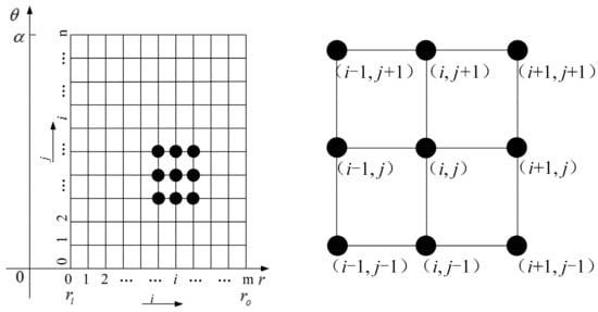 As shown in Figure 5, the basic idea of the finite difference algorithm is to replace the continuous fixed solution region with a grid composed of a finite number of discrete points, which are used as nodes of the grid. For the oil film discussed above, the r direction is divided into m cells and the θ direction is uniformly divided into n cells, then the radial and circumferential steps of the oil film are Δr = 0.005/m and Δθ = 12/n, respectively.