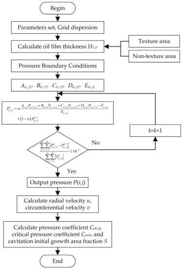 The relevant parameters are solved to calculate the velocity and pressure in the oil film, and the position prediction of cavitation incipient and the corresponding calculation flowchart is shown in Figure 6.