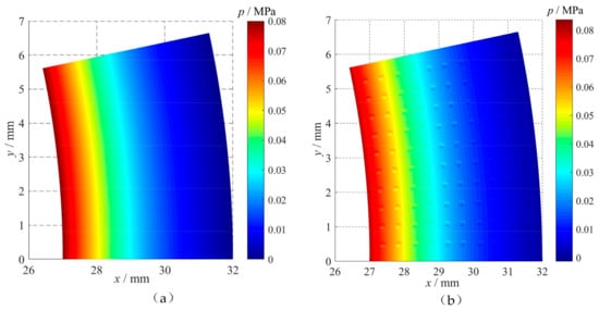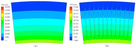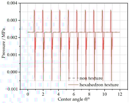 The pressure distribution of the oil film without texture and oil film with homogeneous hexahedral textures are compared in Figure 9. In the oil film without texture, pressure is uniform distributed, with pressure values decreasing along the radius direction. The pressure distribution of the oil film with texture is generally consistent with that of the non-textured oil film. The overall effect is not significant, but sudden pressure changes occur in the texture dimples and the local area around them.