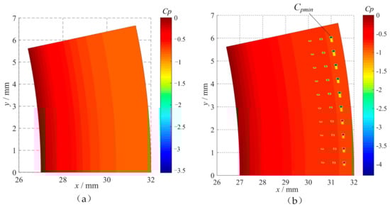 The relationship between the cavitation number and the minimum pressure coefficient is: σi = −Cpmin. Additionally, this method is relatively small in calculation, so the pressure field forecasting method is used to predict the location of cavitation inception.