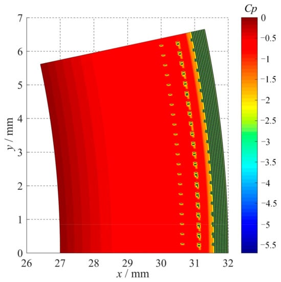 Isolated rough elements and homogeneous rough elements have distinct separate turbulence on the flow field, and it needs to be confirmed whether texture has the same impact on the flow field pressure at low and high densities. Take N = 10 and M = 20 to encrypt the texture distribution. When the texture rate is increased, the pressure coefficient at the outer diameter decreases significantly and is lower than the critical pressure coefficient Cpmin (Figure 12), the cavitation inception area S increases to 0.102, and it is discovered that the cavitation area increases rapidly when the texture density is increased.