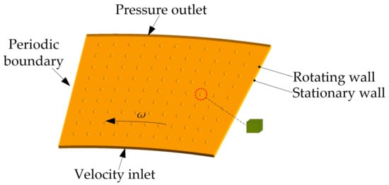 Surface micro-texture technology refers to the introduction of structures, such as micro-dimples, micro-grooves, micro-convex bodies, etc., to improve the frictional lubrication properties of the sliding mechanical interface [,,,,]. Hamilton [] et al. were the pioneers to analyze the effect of micromorphology between parallel plates on the dynamic pressure bearing capacity through the dimensionless and similarity principle of equation, and the effect of factors such as depth, arrangement distribution and relative area of the micromorphology. Siripuram and Stephens [] researched the effect of different texture dimples on hydrodynamic lubrication and friction performance and found that it affected the frictional coefficient lightly, and triangular texture can significantly increase load carrying capacity reducing leakage of oil. Yu [,] et al. analyzed the effect of texture shape and texture orientation on hydrodynamic pressure by a super-relaxation iterative algorithm and used average dimensionless pressure as an index to assess bearing capacity, and found that elliptical dimples perpendicular to the sliding direction produced the best lubrication performance. Liang [] et al. explored the relationship between texture position, texture depth, and oil-film-bearing capacity and found that the bearing capacity could be improved in both converging and diverging regions, and shallow texture in converging regions could better improve lubrication performance, while effect in diverging region was not significant. Han [] et al. modeled the spherical crown texture and simplified it dimensionless, simulated the 3D model in Fluent, and found that the increase of Reynolds number and texture depth enhances the fluid-bearing capacity. Etsion [] nondimensionalized the Reynolds equation and established the hydrodynamic-pressure lubrication equation for a non-contact mechanical seal with hemispherical texture and found that as dimple diameter decreases, the oil-bearing capacity and leakage decreases, the torque increases, and the optimal dimple size is related to the viscosity of the oil. Tala-Ighil [] et al. used the finite difference method to simulate the effect of columnar texture on dynamic pressure radial bearings, based on analysis of different texture arrangements, and found that the bearing surface texture rate of 100% was not effective in increasing the dynamic bearing capacity, and the best effect was achieved when the attitude angle of the texture was 49°, and the thickness of the oil film was able to increase by 1.8%. Arif [] et al. investigated the effect of texture rate on sliding bearings and found the stability of bearing operation decreases when the texture rate increases to a certain value; the oil temperature increases by 10% after textured compared to the untextured bearing.