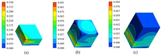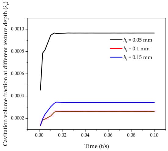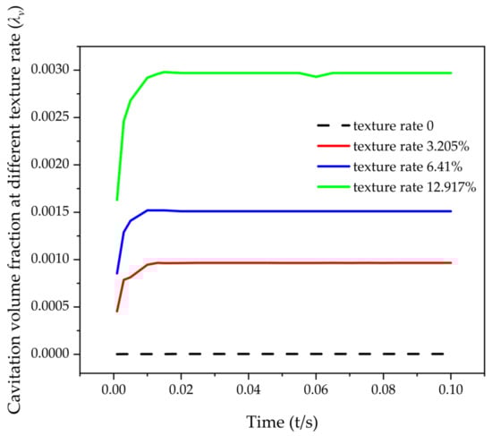 Analysis of velocities of the vapor and liquid phases flowing through the texture cross-section and the flow inside the hexahedral texture dimple revealed that the flow direction and flow pattern between the vapor and liquid phases remained essentially the same. Cavitation occurs when there is a low pressure and a high speed. Cavitation and pressure have an effect on one another. On the one hand, cavitation is more likely to occur in low-pressure areas because low pressure induces cavitation. Cavitation, on the other hand, results in a smaller low-pressure peak and a negative pressure. As a result, the cavitation effect is thought to enhance the dynamic pressure effect.