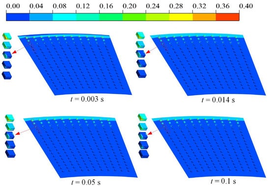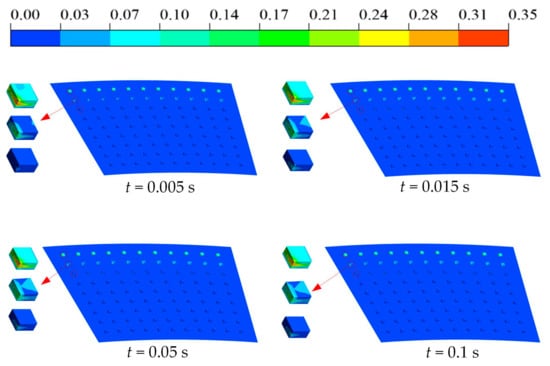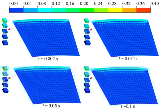 Figure 25 depicts the flow field pressure distribution at n = 6000 rpm. The texture dimples affect the pressure distribution, but the oil pressure distributed consistently overall except for the oil near the dimples, and the cavitation vapor appears at the same location as the low-pressure area.
